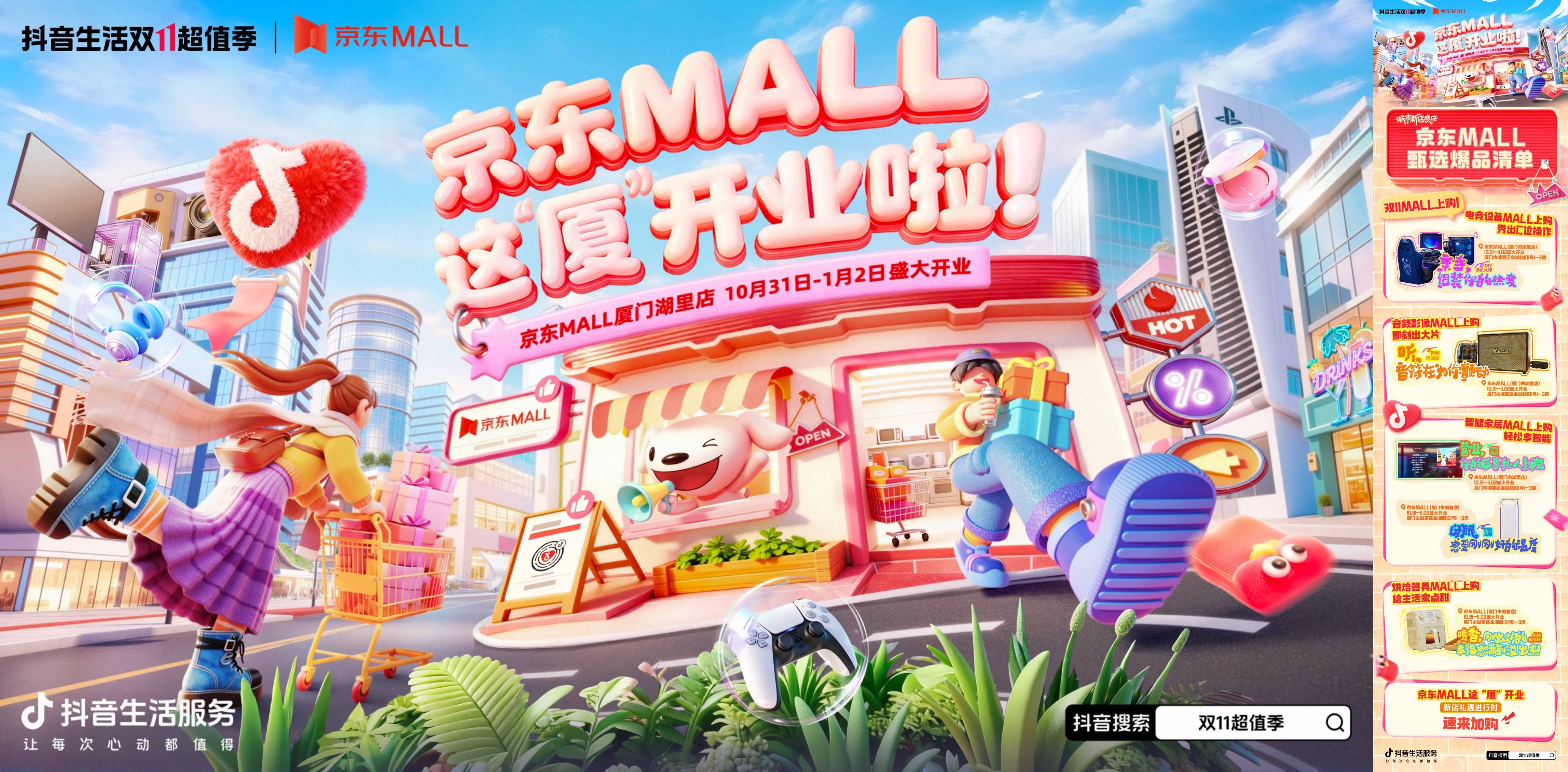 值京东 MALL 厦门湖里店新店开业之际,抖音生活服务以明星「一日店长」等互动活动,透传智慧家电、影像设备等万件尖货一站购的心智,近距离与消费者传递超值生活哲学。京东 MALL 拥有丰富的家居家电产品和科技生活的心智,为抖音生活双 11 超值季提供了线下沟通场景,而抖音则以成熟的内容生态和强大的用户群体为京东 MALL 的新店开业传播助力。