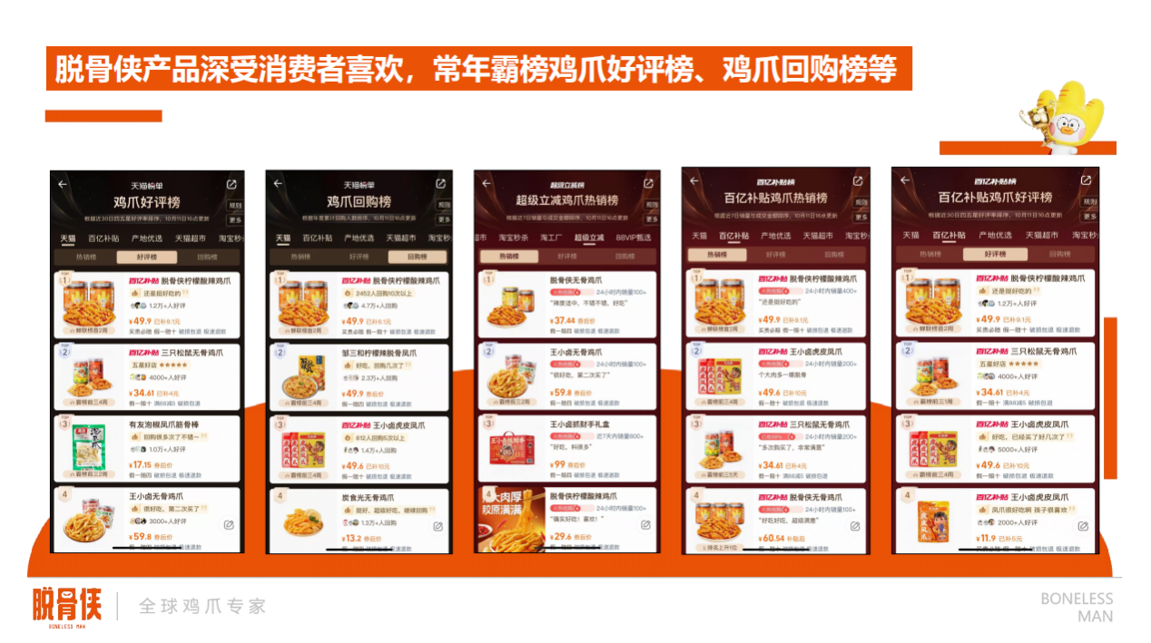 脱骨侠,是一个在2020年上线,明星产品——无骨系列累计销售1亿罐+,并于2024年成为连续三年无骨鸡爪全国销量第一的品牌,广泛受到消费者的认可和喜欢。