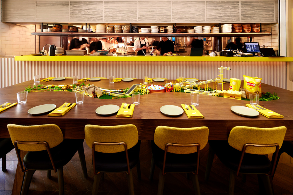 这份先锋美学巧思,更以跨界共创的形态渗透进空间各处。乐事携手时尚设计师品牌8ON8,共同打造极具动态张力的艺术装置:餐厅外立面上,趣味鲜活的小人形象,生动演绎着从土豆到薯片的奇妙转变。他们或搬运土豆或惬意休憩,仿佛为这场土豆盛宴奏响欢快序曲,自然引领食客开启美味探索之旅。
